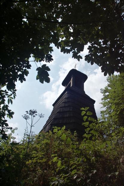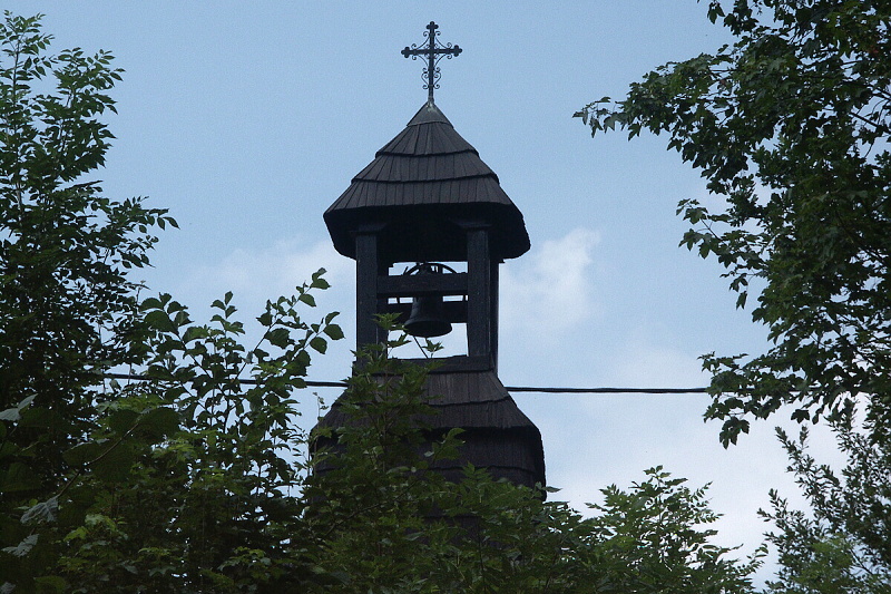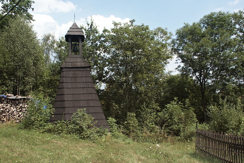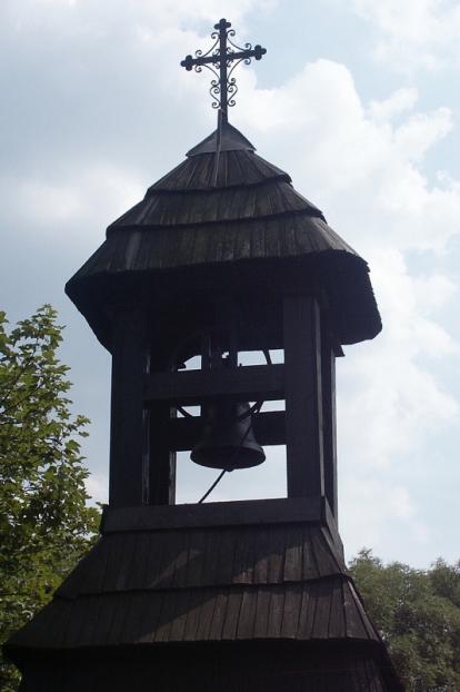 Roubená osmiboká zvonice krytá šindelem se čtyřbokou stříškou na sloupcích z doby kolem r.1800, lidová tesařská práce
